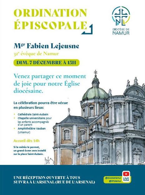 Le diocèse de Namur accueille avec joie la nomination de Mgr Fabien Lejeusne comme 32ème Évêque de Namur. Son ordination épiscopale et sa prise de possession du siège de Namur seront célébrées le dimanche 7 décembre 2025 à 15h00 en la cathédrale Saint-Aubain de Namur. Tous les diocésains y sont chaleureusement invités.( voir actualités diocésaines et informations pratiques)