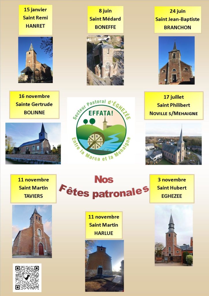 BOLINNE (Sainte Gertrude) – BONEFFE (Saint Médard) – BRANCHON (Saint Jean-Baptiste) – EGHEZEE (Saint Hubert) – HANRET (Saint Remi) – HARLUE (Saint Martin) – NOVILLE SUR MEHAIGNE (Saint Philibert) – TAVIERS (Saint Martin)