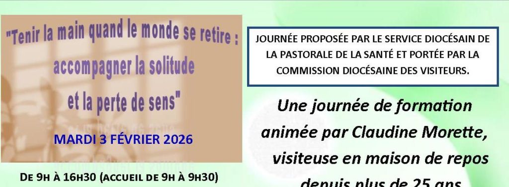 « « Tenir la main quand le monde se retire : accompagner la solitude et la perte de sens » – Une journée de formation pour les Visiteurs de personnes malades, âgées, isolées … animée par Claudine Morette ( de 9h30 à 16h30) Inscription avant le 27 janvier ( plus de détails : voir l’affiche d’informations )