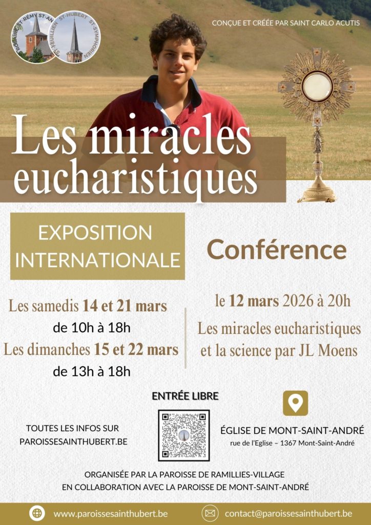 12,14,15,21 et 22 mars : Conférence et exposition internationale : « Les miracles eucharistiques » ( inspirée par C. Acutis) : une invitation de l’UP de Ramillies (détails : affiche et flyers bientôt à disposition dans nos paroisses ) plus d’info
