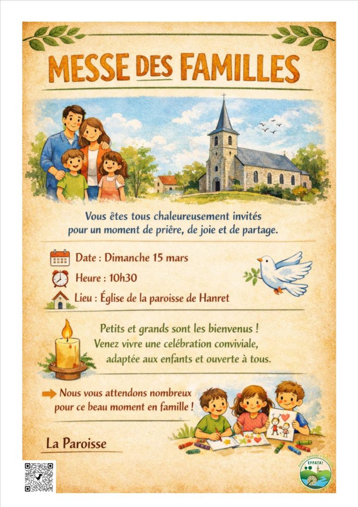 Messe des familles le 15 MARS, 10H30 À HANRET : Un temps fort pour nous retrouver, prier ensemble et nourrir notre foi . Le Seigneur nous invite, quel que soit notre âge, et nous y attend tous !