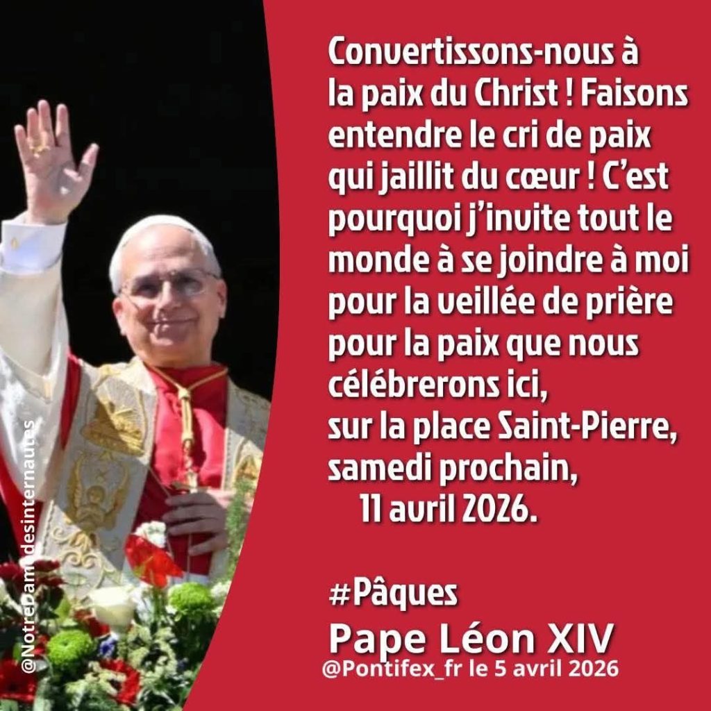 À la suite du message pascal du pape Léon XIV avant sa bénédiction Urbi et Orbi du dimanche de Pâques, l’archevêque Luc Terlinden invite tous les fidèles à participer à une veillée de prière pour la paix entre tous les peuples.[…] La veillée de prière multilingue aura lieu à l’église Notre-Dame au Sablon, au centre de Bruxelles, le samedi 11 avril 2026 à 20h00, en communion avec la veillée qui se tiendra le même jour à la basilique Saint-Pierre de Rome. ( voir cathobel )