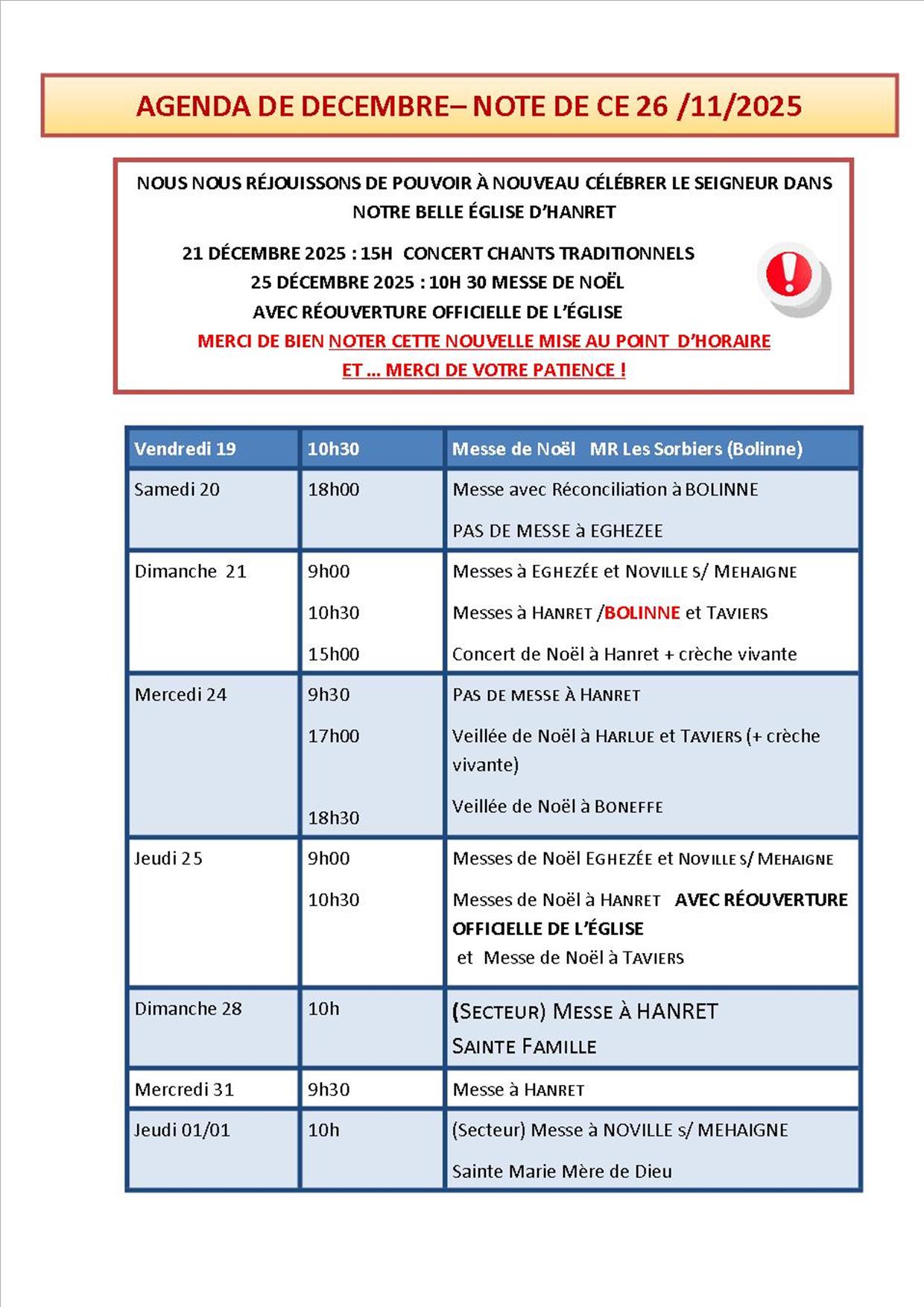 AVIS important : les célébrations de messes auront lieu dans l’église d’Hanret à partir du 25 décembre . Avant cette date , les célébrations de décembre ont toujours lieu à Hanret/Bolinne !