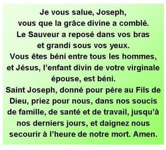 Salut, gardien du Rédempteur, époux de la Vierge Marie .À toi Dieu a confié son Fils ; en toi Marie a remis sa confiance ; avec toi le Christ est devenu homme. O bienheureux Joseph, montre-toi aussi un père pour nous, et conduis-nous sur le chemin de la vie. Obtiens-nous grâce, miséricorde et courage, et défends-nous de tout mal. Amen.